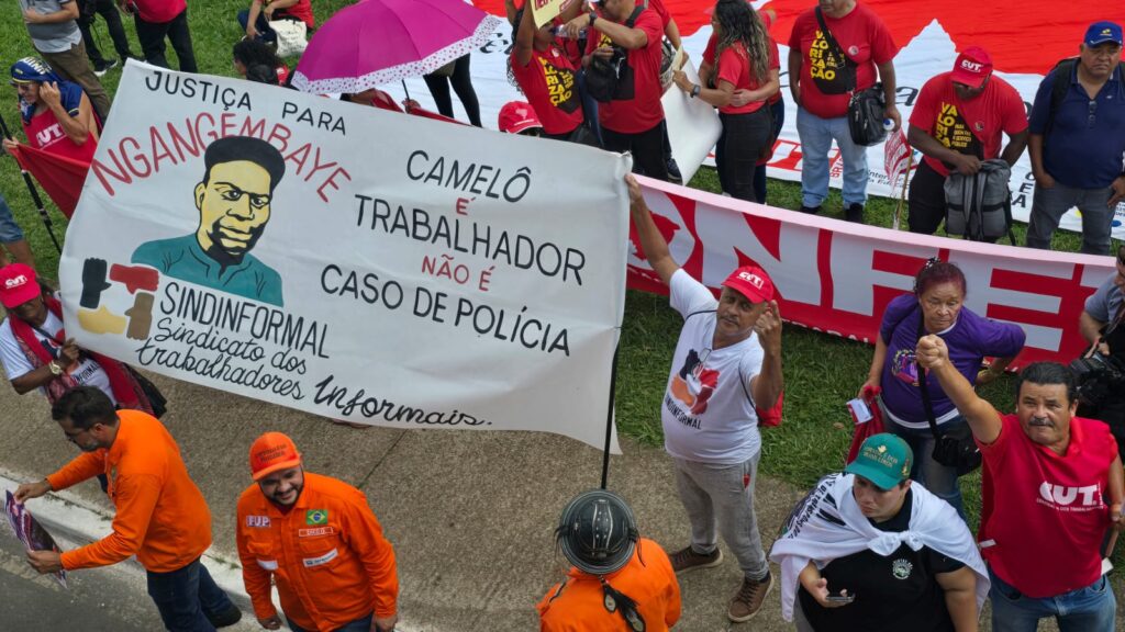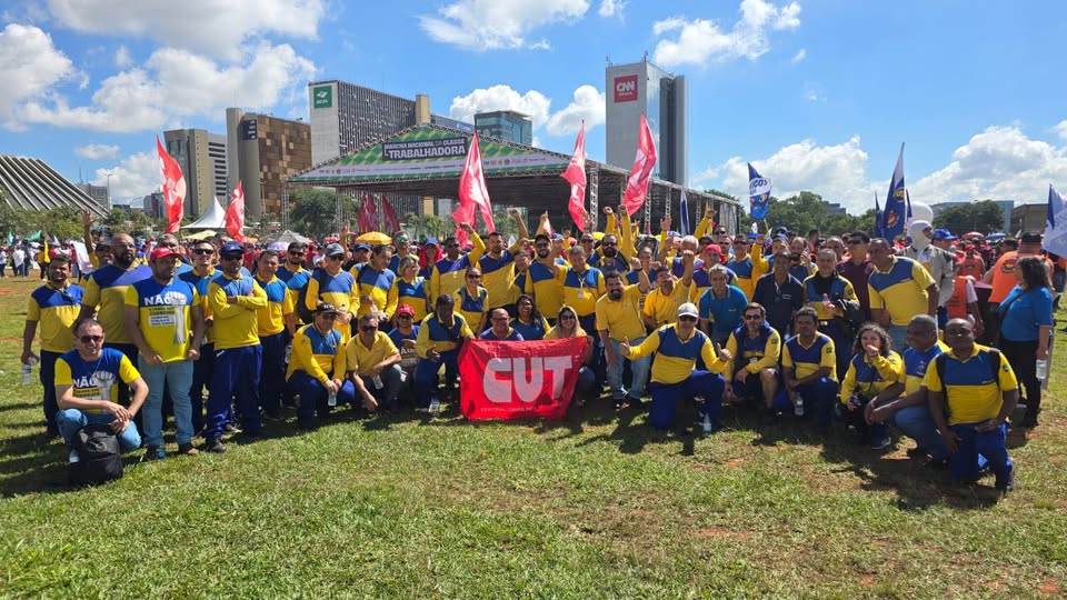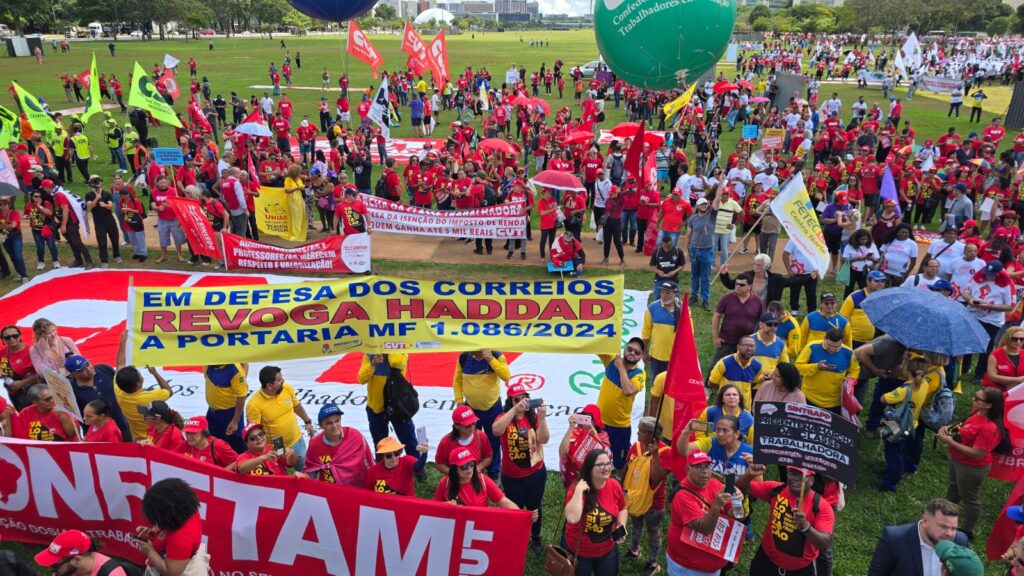 No local, exigiram a revogação da portaria que alterou as regras de remessa conforme, medida que impacta a exclusividade dos Correios no serviço. Após o ato, incorporaram-se à marcha, que seguiu até a frente do Congresso Nacional. A presidenta do Sindicato e diretora da CUT, Amanda Corcino, fez um discurso em nome da central sindical, destacando a importância da mobilização: “Esse é um dia importante de mobilização, com a entrega da pauta da classe trabalhadora. Precisamos pautar esse Congresso sobre a urgência do fim da escala 6×1, a isenção do imposto de renda para quem ganha até 5 mil reais e dizer que o presidente Lula tem todo nosso apoio para continuar com a política de valorização do salário mínimo”.