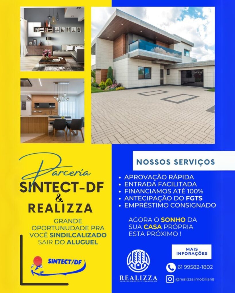 11 de março de 2025 – O SINTECT-DF acaba de fechar um convênio com a Imobiliária Realizza para oferecer aos seus filiados condições especiais na conquista do imóvel próprio. A parceria garante financiamento com parcelas a partir de R$ 500, aprovação rápida e assessoria personalizada para escolha do imóvel ideal.